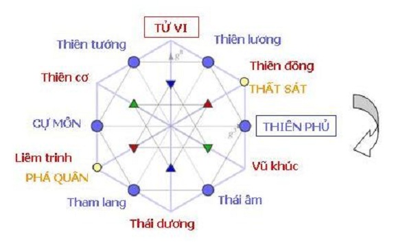 – Vòng Thiên Phủ có 8 sao, gồm: Thiên phủ, Thái âm, Tham lang, Cự môn, Thiên tướng, Thiên lương, Thất sát và Phá quân.